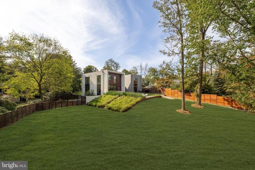 Nestled amidst the verdant bends and winding hills of Chevy Chase, 9119 Levelle Drive is a textbook showcase of cutting edge modernism. Designed in 2021 by the acclaimed Robert M. Gurney, FAIA and built by the renowned Peterson and Collins Builders, the extraordinary skill and craftsmanship is evident throughout and unparalleled. This singular home is yet another award-winning example of geometry, brilliant manipulation of light, artistic use of glass, and conformation with its natural surroundings. Prominently sited on a coveted lot of just under an acre, towards the end of a no-through road, the approaching driveway opens into a rectangular motor court. Two likewise rectangular volumes are situated in a narrow ‘V’ configuration, connected by a glass bridge housing the front door. A transverse gallery introduces the fully open concept main level by its informal spaces first. The chef’s kitchen anchors said space, blending design and function with floor-to-ceiling minimalist, light wood cabinetry concealing a comprehensive suite of commercial-grade appliances. An extraordinary oversized center island, clad in light stone slabs with integrated seating and waterfall edges, spans the entire length of the room. A flooring change from wood to tile, both outfitted with radiant heat, signifies the transition into the adjacent light-filled breakfast area. A generously proportioned, continuous living and dining area comprises the majority of the main level. The latter is backed by full-height panes of glass, letting in tranquil wooded views. The former, anchored by an abstract half-wood half-mosaic fireplace wall, interacts with said views via a wall of glass which can be opened to blur the relationship between indoor and outdoor living. The central staircase, artfully crafted from wood and glass, is both a showstopper and a structural feat, which connects all levels of the home. The upper level contains private quarters, including a stunning primary suite resting amidst the treetops. It features generous closet space with custom built-ins, and the ubiquitous spa-inspired bath with a soothing ambiance attributed to neutral woods and large panes of glass, as well as all the usual accoutrements. Secondary bedrooms are well-proportioned, luxuriously finished, and arranged so as to maximize privacy. Across the glass bridge is the second volume, clad in dark ground face block to contrast the main volume’s white stucco. On the ground level, it houses an oversized garage with a frosted glass door as well as a cozy living space. Upstairs is a fully self-sufficient apartment. The kitchen mirrors that of the main residence, with full-size SubZero and Viking appliances, and a peninsula island overlooking wooded views beyond the adjacent living area. A private bedroom featuring a large walk-in closet, as well as a luxurious fully-tiled bath complete the unit. Enclosed by full fencing constructed of mahogany and steel, the rear lawn comprises terraced outdoor living spaces designed to engage with the lot’s topography. They include dual-level patios with a fire pit, ideal for al fresco entertaining, dining, or lounging on a crisp autumn evening. Further beyond, private rolling hills are surrounded by total privacy. Convenient to the shopping, dining, and entertainment of both downtown Bethesda and Chevy Chase, as well as the Nature Conservatory and trails along Beach Drive and major commuter routes, the location is enviable. Not to be replicated in its architectural significance, 9119 Levelle Drive is a true one- of-a-kind offering.